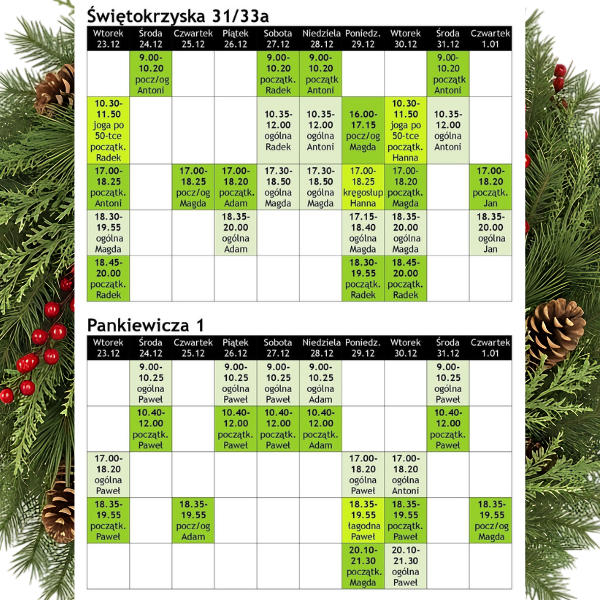 [vc_row][vc_column][vc_column_text] Grupy tematyczne - Świętokrzyska 31/33a - czwartki 20.10 11 grudnia - stabilność i ugruntowanie — praca w pozycjach stojących - Agnieszka 18 grudnia - otwieranie klatki piersiowej — wygięcia w tył z ochroną lędźwi - Agnieszka 8 stycznia - Magda 15 stycznia - Magda Grupy tematyczne - Pankiewicza 1 -...