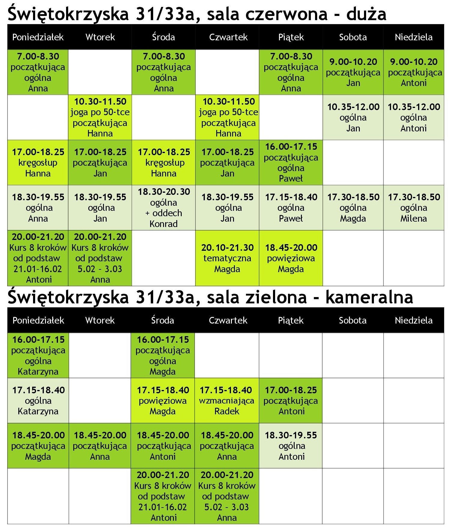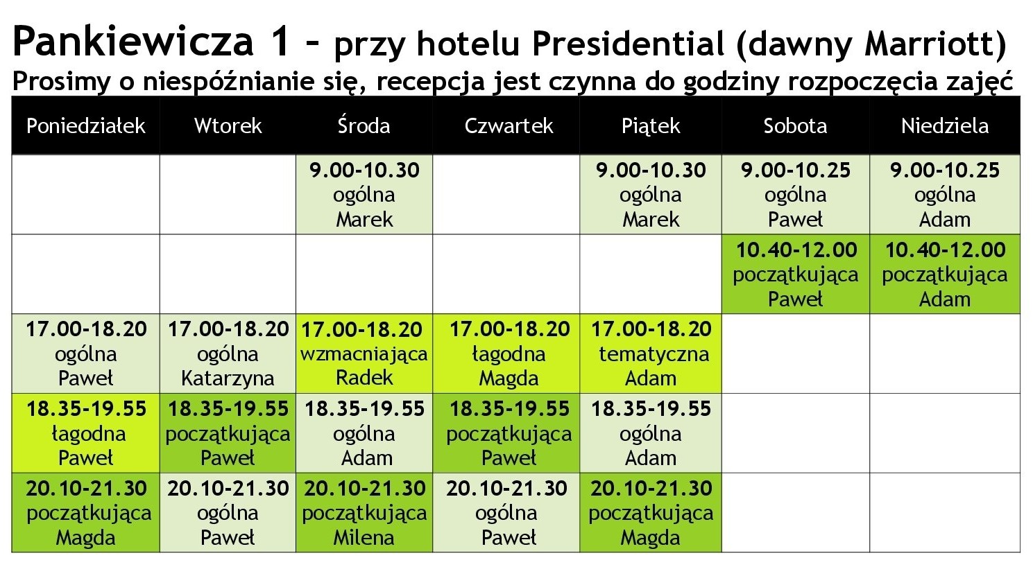 Zalecamy udział w 8-10 zajęciach tej grupy przed przejściem na grupę ogólną. Zajęcia te polecamy także po dłuższej przerwie w praktyce.